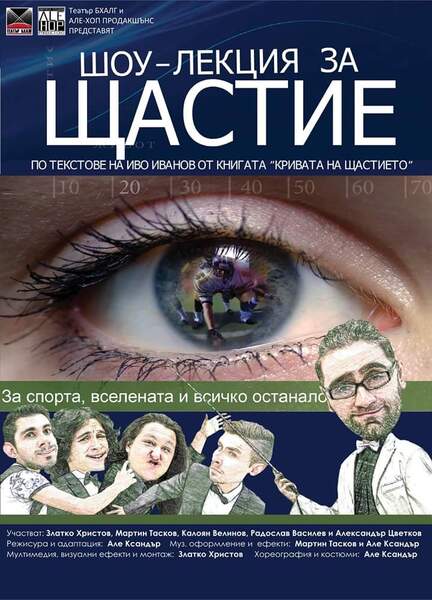Щастие! Що е то? Състояние, миг от вечността или просто понятие? Всички го търсим, но не всеки го намира? Знаем какво значи, но ни е трудно да го обясним? Някои твърдят че са го открили, но защо ли след малко усещат че им липсва? На всички тези въпроси ще ви отговори екипът на „Шоу-лекция за щастие". Програмата е базирана изцяло на някои от текстовете на Иво Иванов от книгата му „Кривата на щастието", като характерните за шоу-спектакъл средства и елементи, като песни, танци , аудио-визуални ефекти и др. , придават развлекателен характер на сценичната адаптация.